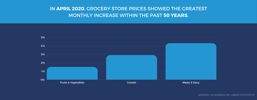 Due to supply and demand pressures from the coronavirus, food price increases are at a 50-year high. The Center for Strategic and International Studies reports that in April, towards the beginning of the pandemic, grocery store prices showed the greatest monthly increase within the past 50 years. Rising food prices included prices on poultry, fish, meats, and eggs (4.3 percent increase); cereals (2.9 percent increase); and fruits and vegetables (1.5 percent increase). For example, meat plants are producing fewer products, which then causes grocery stores to reduce their supplies. And with the closure of restaurants, more families are eating at home, which increases the demand at grocery stores.