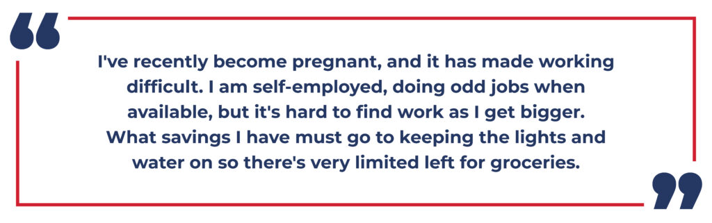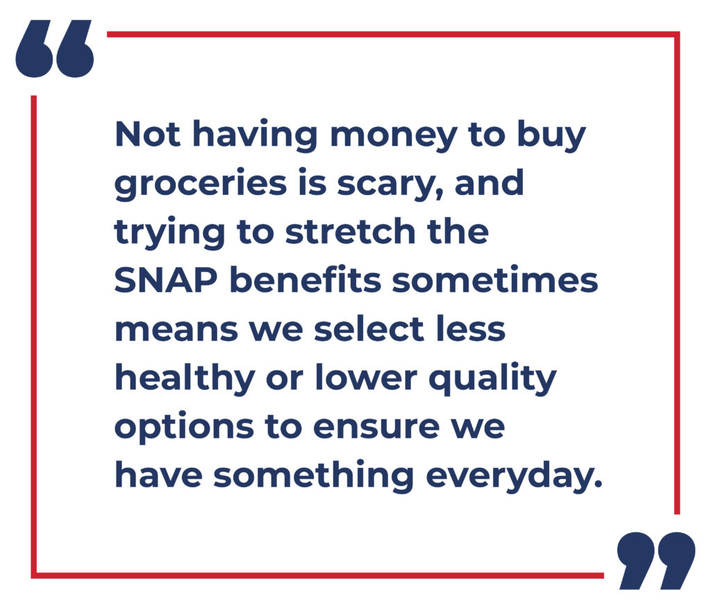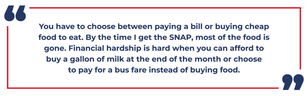 Despite varying backgrounds and experiences, the maternal caregivers who applied for assistance via Full Cart® detailed similar challenges when it comes to providing enough food for their children, themselves, and their families. They shared about their experience with financial hardship and having difficulty making ends meet even with the aid of additional benefits like SNAP. Approximately, 61.9% of maternal caregivers reported making less than $25,000 in household income with a majority (98.3%) also stating that, within the last 12 months, they have worried about their food running out before receiving money to purchase more. One mother explained, “We have a large household and I’m also pregnant. The kids eat every meal, they never miss. But more times than not, at least one adult doesn’t eat because we don’t have enough.” Many maternal caregivers reported having trouble stretching the amount of food they need to feed everyone in their household on a daily (24.3%) and weekly (35.1%) basis. Despite more than 1 in 3 women being recipients of SNAP benefits, several explained that their benefits are not sufficient to meet their family’s needs as they balance the food budget with other bills and essentials.