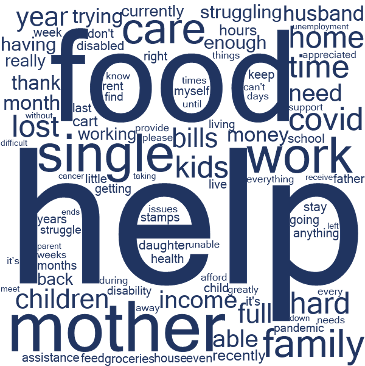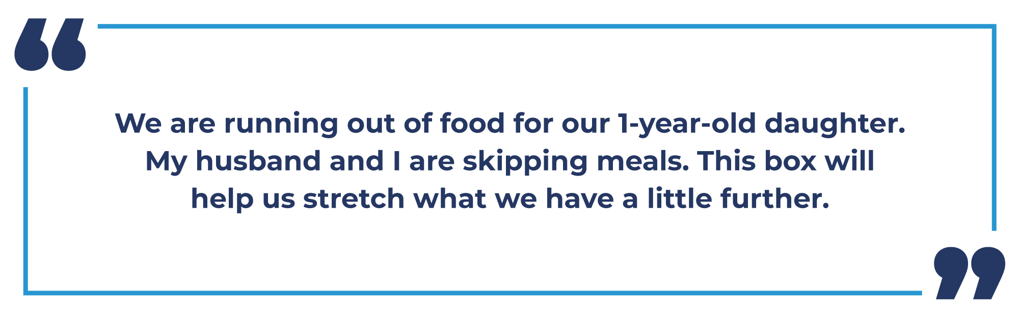 Due to the sacrifices many parents and caregivers make to acquire and provide enough food for those they care for, children are often protected from very low food insecurity and the most severe forms of coping strategies to combat food insecurity. According to the United States Department of Agriculture, about 12.5% of households with children under the age of 18 experienced food insecurity in the United States in 2021. Both adults and children were food insecure in 6.2% of those households. These statistics demonstrate that adults are more likely to protect children from experiencing hunger and suggest that age may be a predictor of food insecurity. One Full Cart recipient supporting a family of eight stated that with the rising prices of housing, food, and gas, a “[Full Cart] box will allow us the security of knowing we will be able to keep food on the table for the kids.” While another parent who was waiting to receive SNAP benefits explained, “We are running out of food for our 1-year-old daughter. My husband and I are skipping meals. This box will help us stretch what we have a little further.”