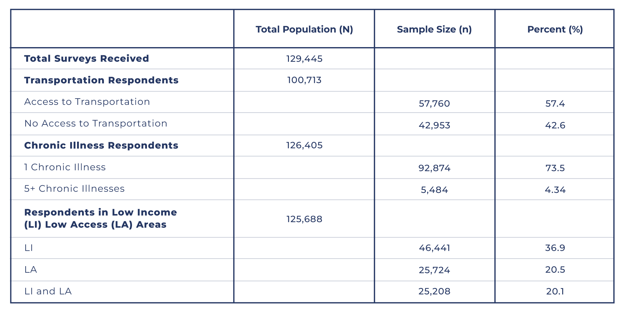 Table 1. The total population size (N), sample population size (n), and their corresponding percentages based on responses to various survey questions.